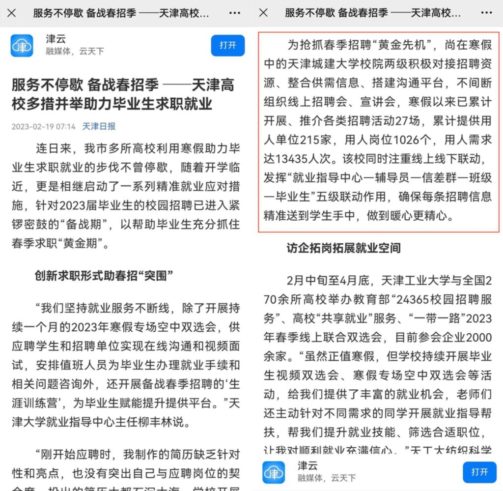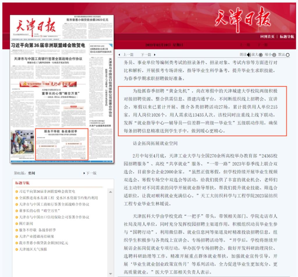 2月19日,《天津日報》、津云客戶端以《服務不停歇備戰春招季》為題報道了我市多所高校多措并舉助力畢業生求職就業的典型案例。其中,對我校寒假暖心就業服務不斷線工作進行報道。具體如下: