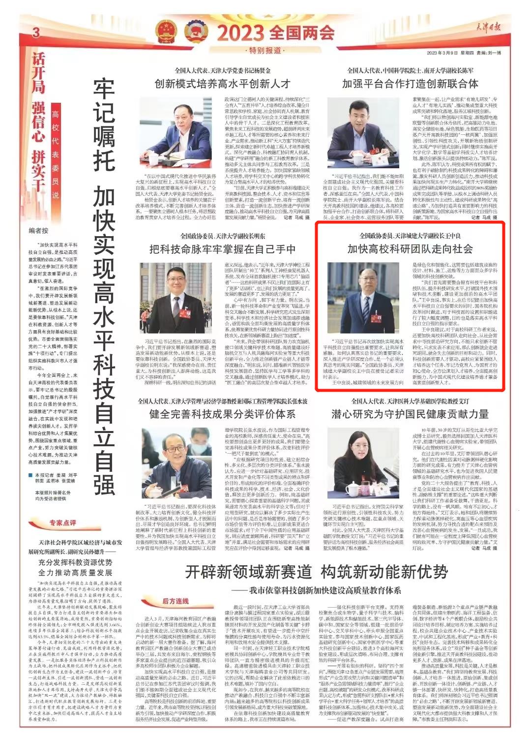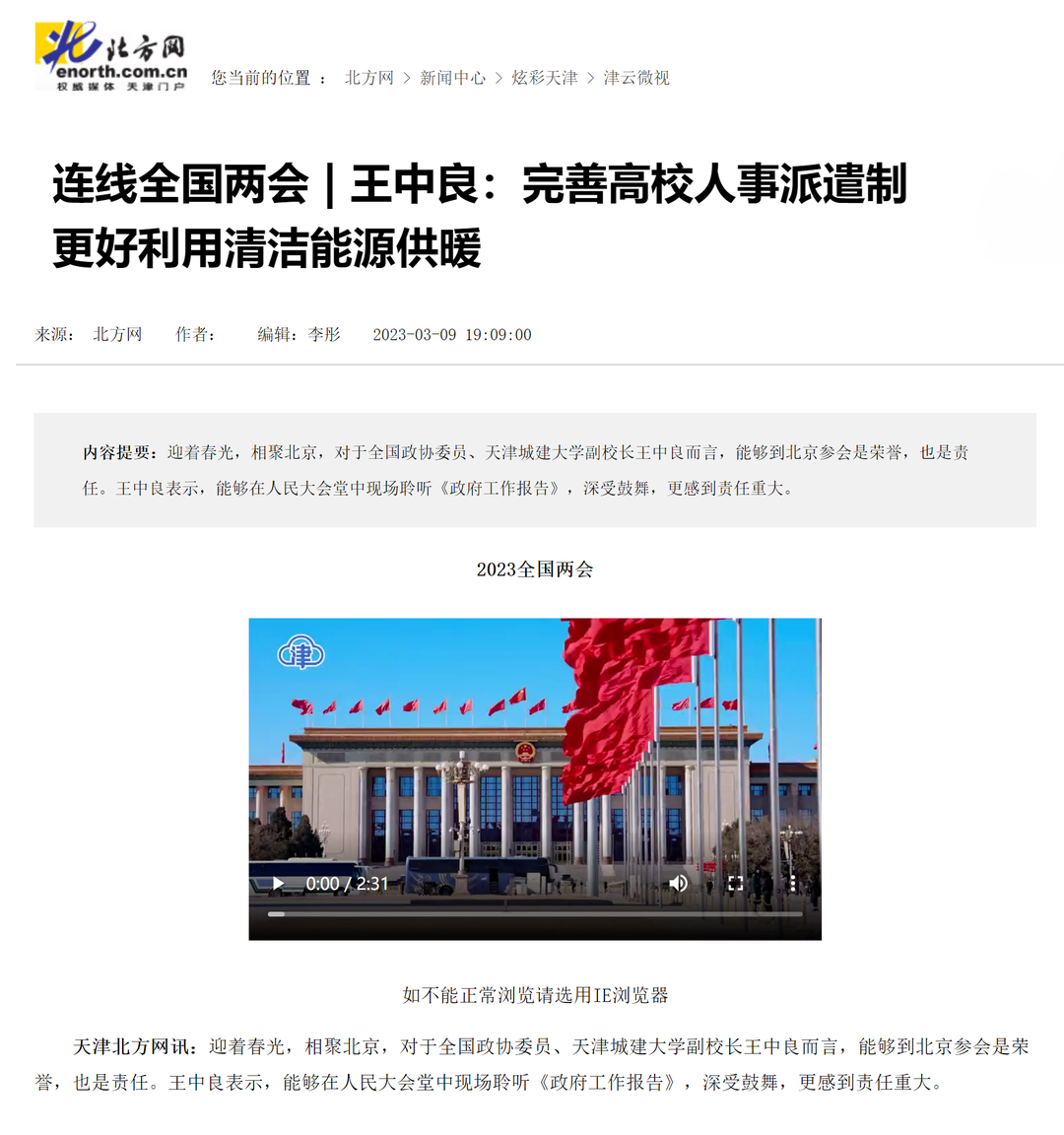 中國(guó)人民政治協(xié)商會(huì)議第十四屆全國(guó)委員會(huì)第一次會(huì)議、第十四屆全國(guó)人民代表大會(huì)第一次會(huì)議分別于3月4日、5日在北京人民大會(huì)堂開幕。連日來(lái),全國(guó)政協(xié)委員、我校副校長(zhǎng)王中良認(rèn)真履行神圣職責(zé),積極建言獻(xiàn)策,圍繞“完善高校人事派遣制”、“ 更好利用清潔能源供暖”等提案,在全國(guó)兩會(huì)上發(fā)出天城大聲音。3月9日,《天津日?qǐng)?bào)》、津云客戶端、北方網(wǎng)等多家媒體對(duì)王中良的提案進(jìn)行相關(guān)報(bào)道,現(xiàn)將部分媒體報(bào)道匯總?cè)缦拢?/p>