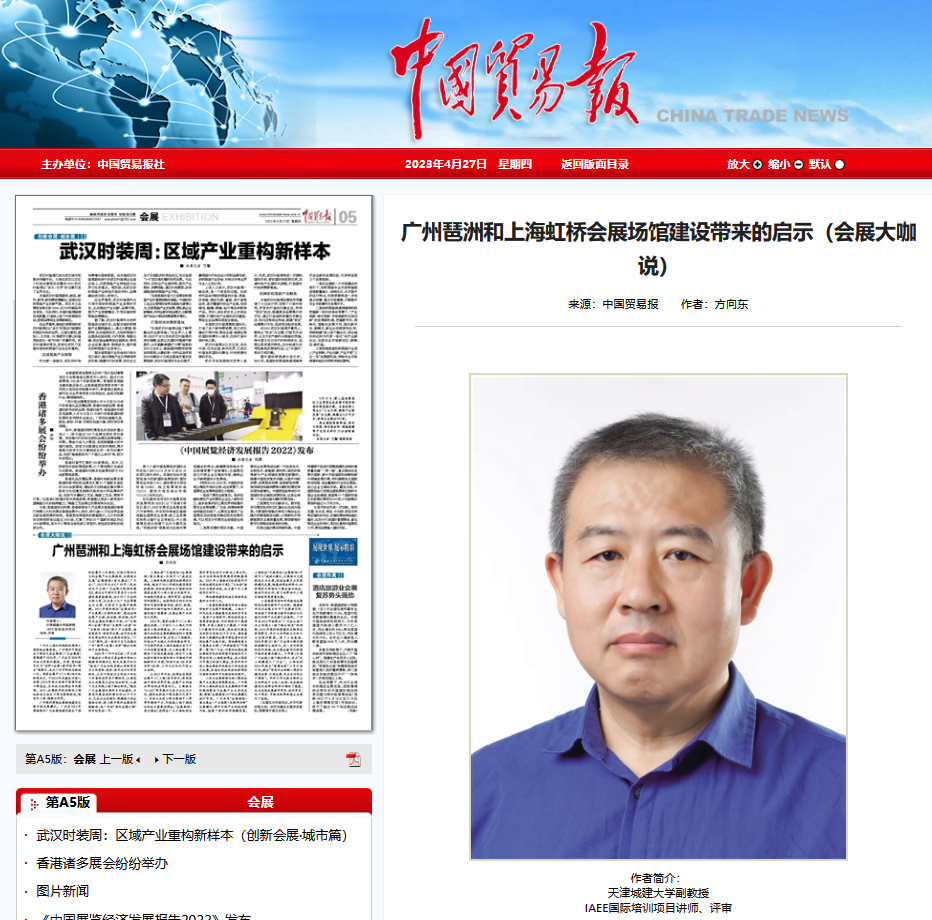 近日出版的《中國貿易報》刊發我校城市藝術學院產品設計系主任方向東副教授理論文章《廣州琶洲和上海虹橋會展場館建設帶來的啟示(會展大咖說)》。文章基于廣州琶洲和上海虹橋會展場館建設模式,從重視展館建設和重點展會持續擴大會展市場規模,以會展場館為核心聚焦會展產業發展發揮集聚效應,超前思維和布局推動會展科技發展和數字產業創新三方面分享了展館建設促進區域經濟發展啟示與思考。原文如下: