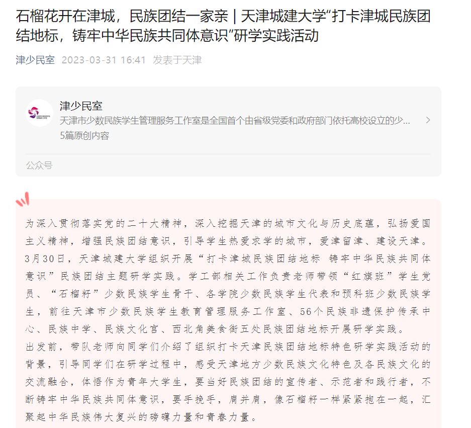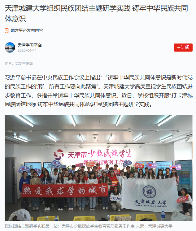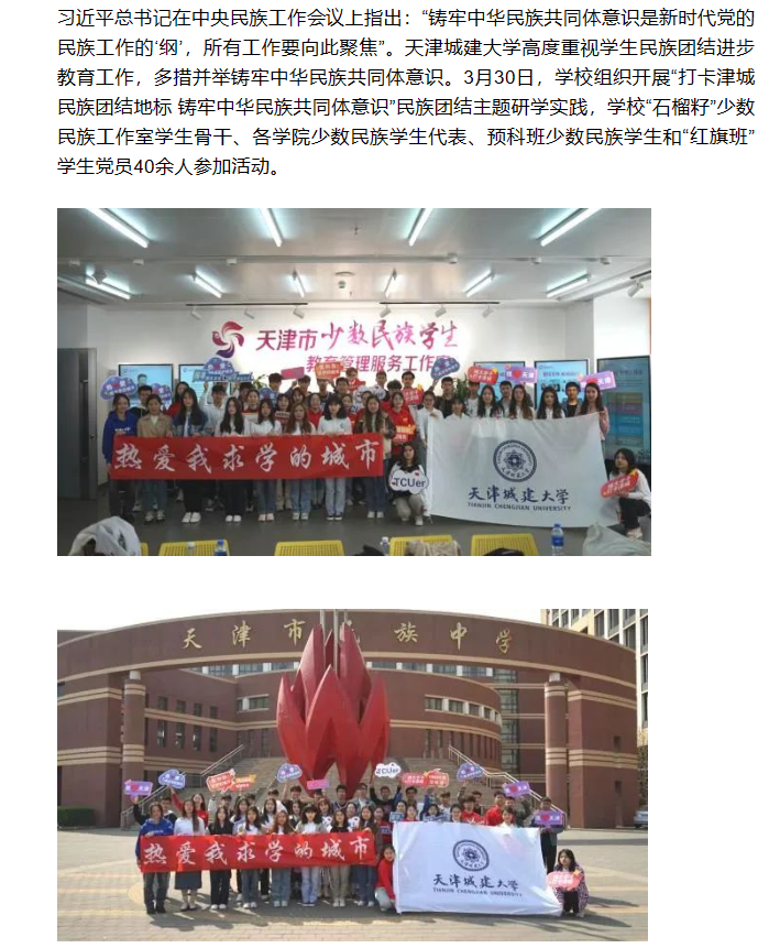 習近平總書記在中央民族工作會議上指出:“鑄牢中華民族共同體意識是新時代黨的民族工作的‘綱’,所有工作要向此聚焦”。天津城建大學高度重視學生民族團結進步教育工作,多措并舉鑄牢中華民族共同體意識。近日,學校組織開展“打卡津城民族團結地標 鑄牢中華民族共同體意識”民族團結主題研學實踐。