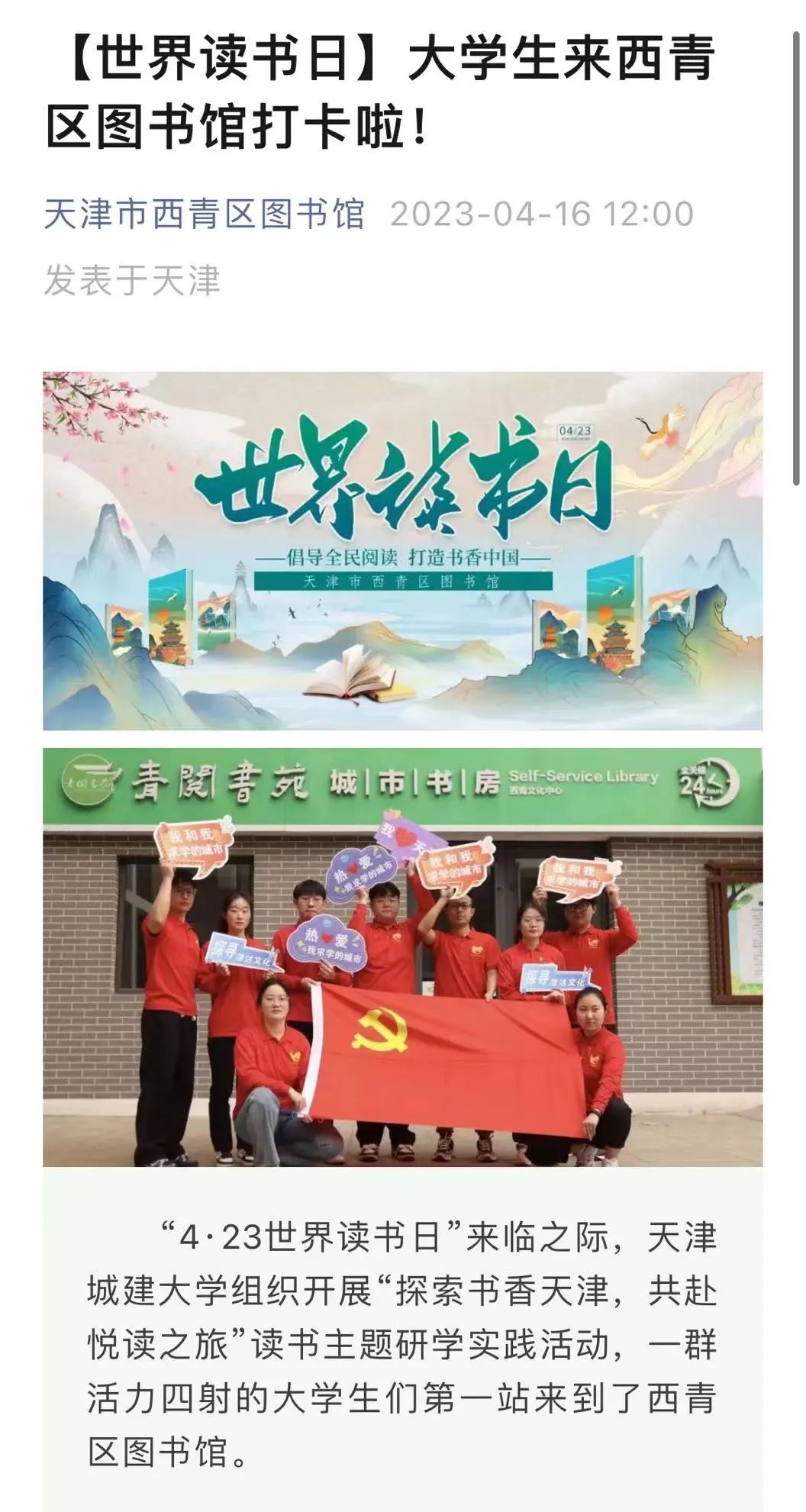 “4·23世界讀書日”來臨之際,天津城建大學組織開展“探索書香天津,共赴悅讀之旅”讀書主題研學實踐活動,一群活力四射的大學生們第一站來到了西青區圖書館。