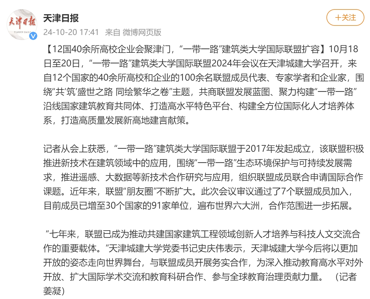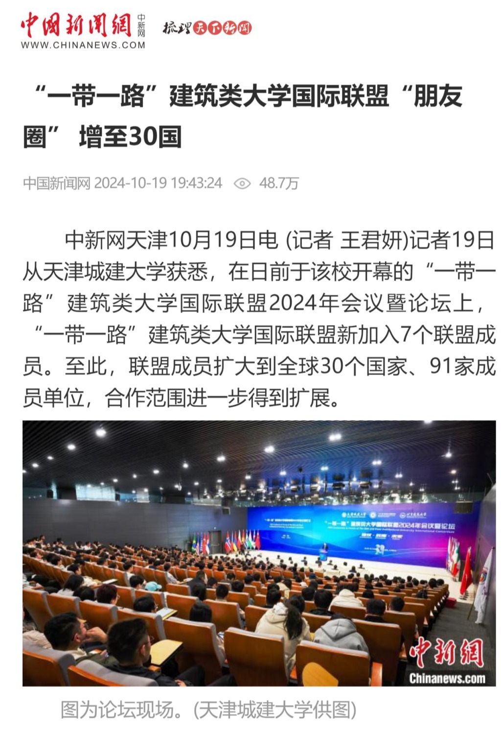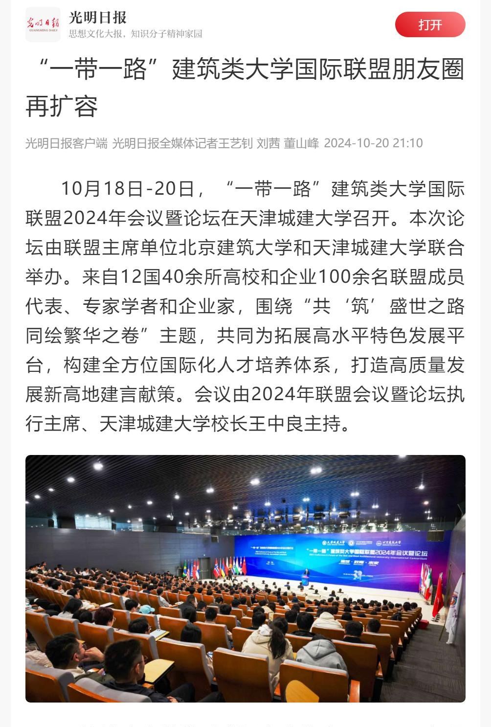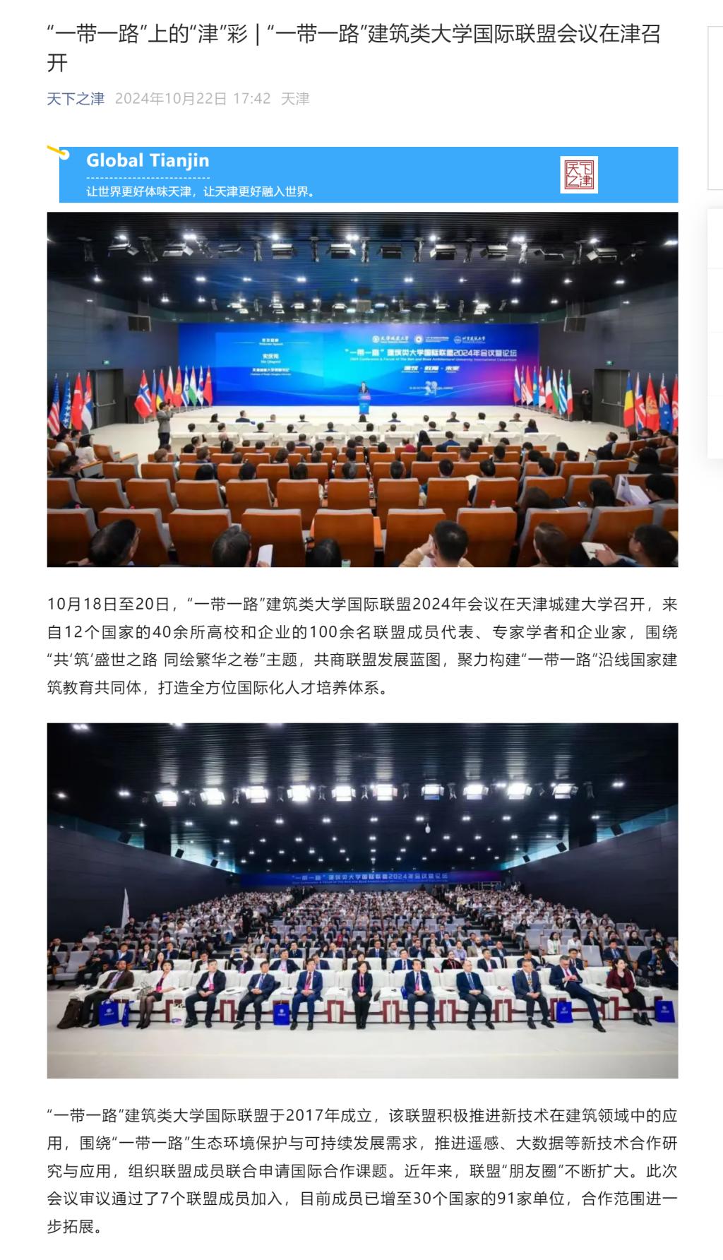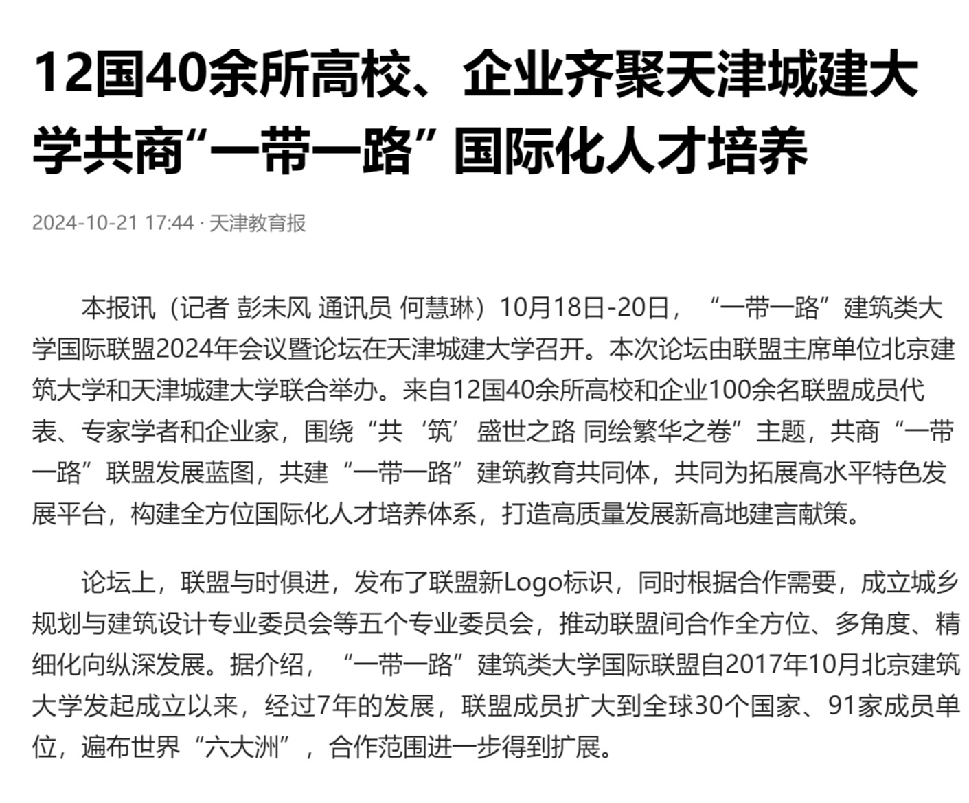 10月18日-20日,“一帶一路”建筑類大學國際聯盟2024年會議暨論壇在我校隆重召開。來自12個國家的20余位大學校長和企業家、40余所高校與機構的百余名聯盟成員代表,圍繞“共‘筑’盛世之路 同繪繁華之卷”主題,共商“一帶一路”聯盟發展藍圖,共建“一帶一路”建筑教育共同體,共同為拓展高水平特色發展平臺,構建全方位國際化人才培養體系,打造高質量發展新高地建言獻策。會議受到了人民日報、新華社、光明日報、中國日報、中國新聞網、中國青年報、中國教育新聞網、天津日報、津云、天津教育報等多家媒體宣傳報道。