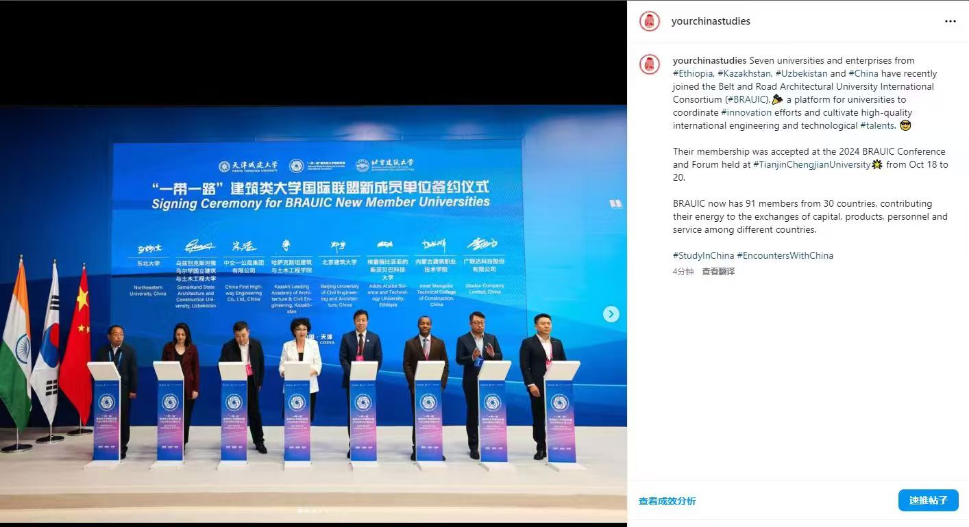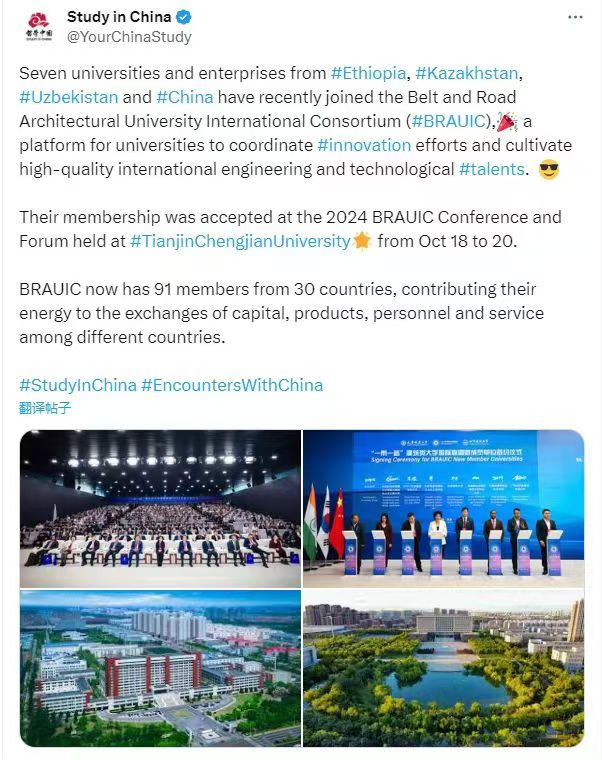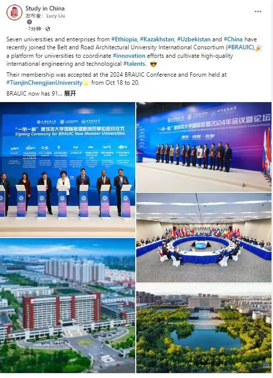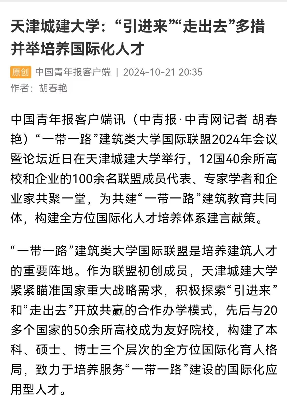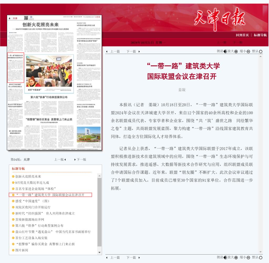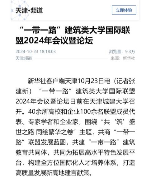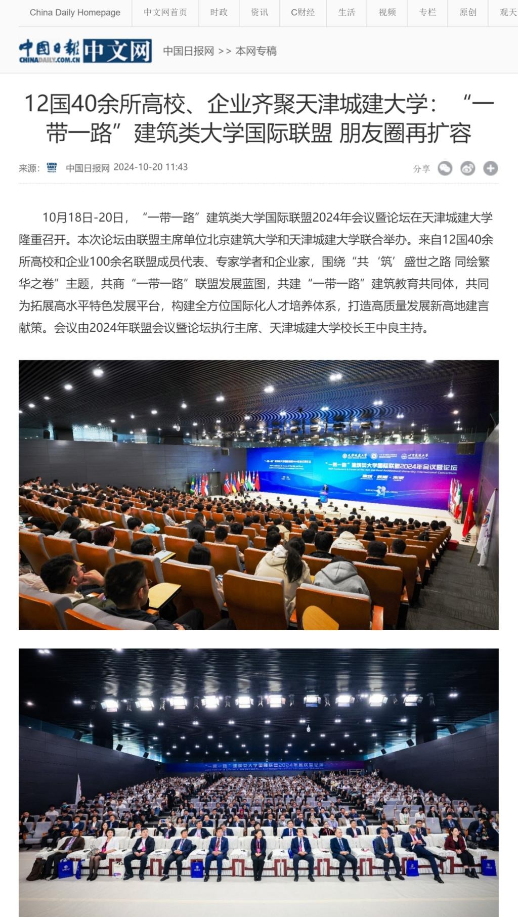 10月18日-20日,“一帶一路”建筑類大學國際聯盟2024年會議暨論壇在我校隆重召開。來自12個國家的20余位大學校長和企業家、40余所高校與機構的百余名聯盟成員代表,圍繞“共‘筑’盛世之路 同繪繁華之卷”主題,共商“一帶一路”聯盟發展藍圖,共建“一帶一路”建筑教育共同體,共同為拓展高水平特色發展平臺,構建全方位國際化人才培養體系,打造高質量發展新高地建言獻策。會議受到了人民日報、新華社、光明日報、中國日報、中國新聞網、中國青年報、中國教育新聞網、天津日報、津云、天津教育報等多家媒體宣傳報道。